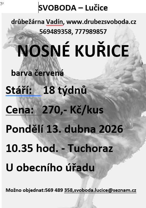 PRODEJ KUŘIC Pondělí 13.dubna 2026 10:35 u obecního úřadu