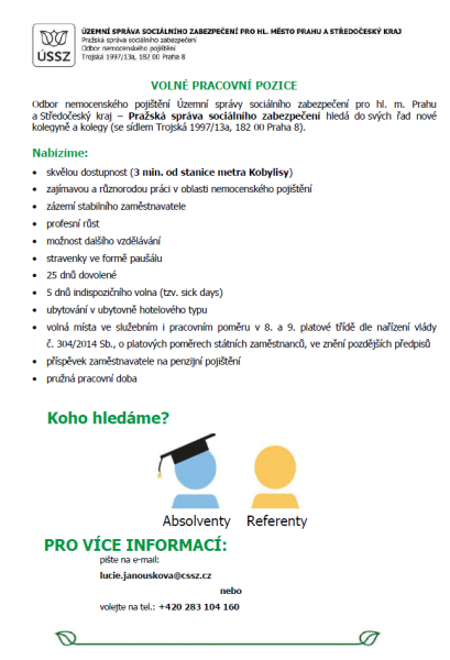 Územní správa sociálního zabezpečení pro hlavní město Prahu vyhlašuje výběrové řízení na volné pracovní pozice. Hledáme absolventy a referenty, kteří se chtějí zapojit do zajímavé a různorodé práce v oblasti nemocenského pojištění. Nabízíme skvělou dostupnost, zázemí stabilního zaměstnavatele a dalš